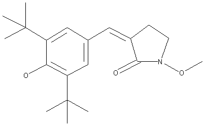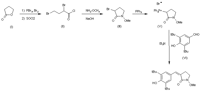 The reaction of gamma-butyrolactone (I) with Br2 and PBr3 at 100 C followed by a treatment with SOCl2 gives 2,4-dibromobutanoyl chloride (II), which is condensed with O-methylhydroxylamine by means of NaOH in CHCl3 yielding N-methoxy-3-bromopyrrolidin-2-one (III). The reaction of (III) with triphenylphosphine (IV) in hot THF affords the triphenylphosphonium salt (V), which is finally condensed with 3,5-di(tert-butyl)-4-hydroxybenzaldehyde (VI) by means of triethylamine in hot ethanol.