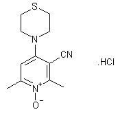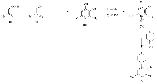 The cyclization of ethyl acetoacetate (I) with 3-amino-2-butenenitrile (II) gives 4-hydroxy-2,6-dimethylpyridine-3-carbonitrile (III), which is treated with SOCl2 and oxidized with MCPBA to yield 4-chloro-2,6-dimethylpyridine-3-carbonitrile N-oxide (IV). Finally, this compound is condensed with thiomorpholine (V) to afford the target compound.