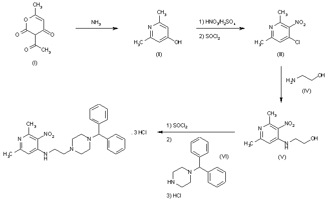 The reaction of 3-acetyl-6-methyl-3,4-dihydro-2H-pyran-2,4-dione (I) with ammonia gives 2,6-dimethylpyridin-4-ol (II), which is nitrated with HNO3/H2SO4 and treated with SOCl2 to yield 4-chloro-2,6-dimethyl-3-nitropyridine (III). The condensation of (III) with ethanolamine (IV) affords N-(2,6-dimethyl-3-nitropyridin-4-yl)ethanolamine (V), which is finally condensed with 1-(diphenylmethyl)piperazine (VI) by means of SOCl2 and treated with HCl to furnish the target trihydrochloride.