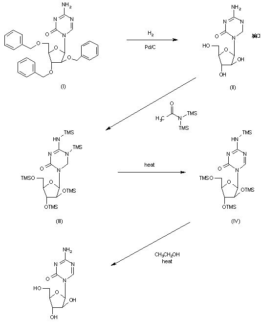 Hydrogenation of 4-amino-1-(2,3,5-tri-O-benzyl-beta-D-arabinofuranosyl-1,3,5-triazin-2(1H)-one (I) in ethanolic hydrogen chloride and palladium on charcoal catalyst produces 4-amino-5,6-dihydro-1-(beta-D-arabinofuranosyl)-1,3,5-triazin-2(1H)-one hydrochloride (II). This is treated with bis (trimethylsilyl)trifluoroacetamide in acetonitrile solution to give the pentakis-trimethylsilyl derivative (III). Conversion to arabinosyl-5-azacytosine as the tetrakis-trimethylsilyl derivative (IV) is complete following 53 h of reflux of the silylation solution. The solution is then evaporated. The residual is boiled with methanol to remove the trimethylsilyl groups.