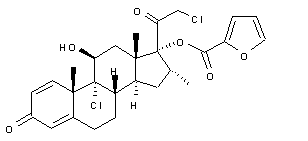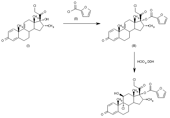 The esterification of 21-chloro-17alpha-hydroxy-16alpha-methyl-1,4,9(11)-pregnatriene-3,20-dione (I) with 2-furoyl chloride (II) by means of TEA gives the corresponding ester (III), which is then treated with HClO4 and 1,3-dichloro-5,5-dimethylhydantoin (DDH) in THF/water in order to add Cl-OH to the 9(11)-double bond of ester (III).