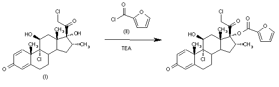 By esterification of mometasone (I) with 2-furoyl chloride (II) by means of TEA in dichloromethane.