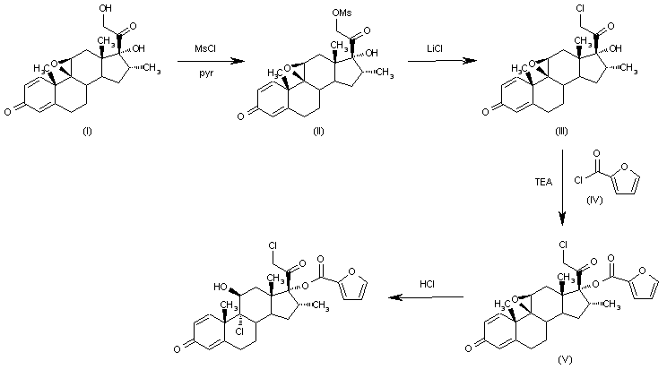 The reaction of 9beta,11beta-epoxy-17alpha,21-dihydroxy-16alpha-methyl-1,4-pregnadiene-3,20-dione (I) with MsCl in pyridine gives the corresponding 21-mesylate (II), which is treated with LiCl in the same solvent to yield 21-chloro-9beta,11beta-epoxy-17alpha-hydroxy-16alpha-methyl-1,4-pregnadiene-3,20-dione (III). The esterification of (III) with 2-furoyl chloride (IV) and TEA affords the expected ester (IV), which is finally treated with anhydrous HCl in acetic acid in order to open the epoxide ring to provide the target mometasone furoate. A similar reaction sequence can be performed using p-toluenesulfonyl chloride instead of mesyl chloride in the first step of the sequence.