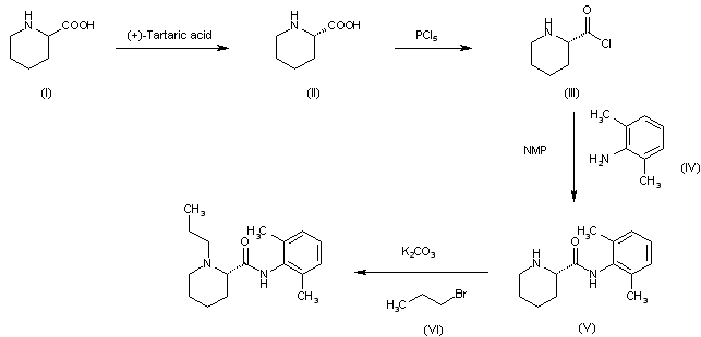 Optical resolution of DL-pipecolinic acid (I) with (+)-tartaric acid gives L-pipecolinic acid (II), which is treated with PCl5 to obtain acil chloride (III). This compound is condensed with 2,5-dimethylaniline (IV) by means N-methylpirrolidine (NMP) to afford amide (V). Finally, amide (V) is alkylated with 1-bromopropane by means potassium carbonate (K2CO3) to yield Ropivacaine.