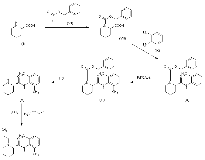 L-Picolinic acid (II) is protected with benzyl chloroformiate (VII) to afford compound (VIII), which is condensed with 2-methylaniline (IX) by means SOCl2/DMAP to yield amide (X). This compound (X) is methylated by treatment with palladium acetate (Pd(Oac)2) to obtain compound (XI), which is deprotected by means HBr to yield compound (V). Finally, this compound (V) is alkylated with 1-iodopropane by means potassium carbonate (K2CO3) to yield Ropivacaine.