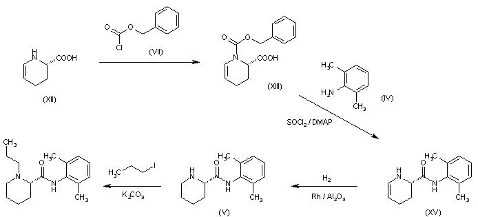 Compound (XII) is protected with benzyl chloroformiate (VII) to afford compound (XIII), which is condensed with 2,5-dimethylaniline (XIV) by means SOCl2/DMAP to yield amide (XIV). This compound (XIV) is deprotected by means trimethylsillyl chloride to yield compound (XV), which is hydrogenated by means Rh/Al2O3. Finally, this compound (V) is alkylated with 1-iodopropane by means potassium carbonate (K2CO3) to yield Ropivacaine.