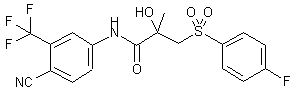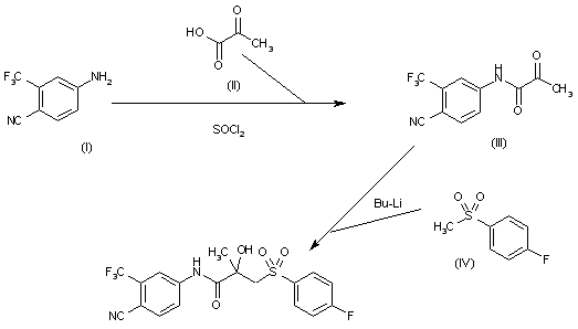 The reaction of 4-amino-2-(trifluoromethyl)benzonitrile (I) with 2-oxopropionic acid (II) by means of SOCl2 gives the corresponding amide (III), which is finally condensed with the methyl sulfone (IV) by means of BuLi in THF.