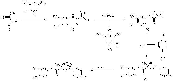 Coupling of methacryloyl chloride (I) with substituted aniline (II) in dimethylacetamide yields amide (III), which is then converted into the epoxy derivative (IV) by oxidation with m-chloroperbenzoic acid (mCPBA) and 4-methyl-2,6-di-tert-butylphenol (A) in refluxing 1,1,1-trichloroethane. Condensation of (IV) with thiol (V) by means of NaH in THF provides fluorophenylthio derivative (VI), which is finally oxidized with mCPBA in CH2Cl2 to furnish the desired compound trichloroethane.