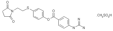The alkylation of succinimide (I) with 1,2-dibromoethane (II) by means of K2CO3 in refluxing butanone gives N-(2-bromoethyl)succinimide (III), which is condensed with 4-hydroxythiophenol (IV) by means of K2CO3 in refluxing ethanol to afford 4-hydroxyphenyl 2-succinimidoethyl sulfide (V). Finally, this compound is esterified with 4-guanidinobenzoyl chloride in pyridine, and treated with methanesulfonic acid in methanol.