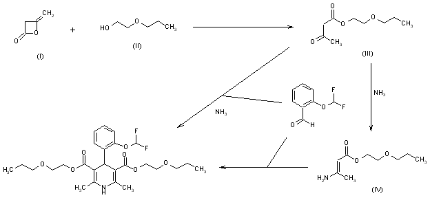 Cerebrocrast is prepared in Hantzsch-type reaction from 2-(propoxy)ethyl acetoacetate (III), 2-(difluoromethoxy)benzaldehyde and ammonia, or from 2-(propoxy)ethyl beta-aminocrotonate (IV) and 2-(difluoromethoxy)benzaldehyde. The necessary raw material, 2-(propoxy)ethyl acetoacetate (III), is prepared from 2-(propoxy)ethanole (II) by acetoacetylation with diketene (I).