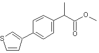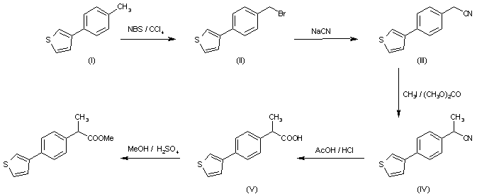 The reaction of 3 p-tolylthiophene (I) with N-bromosuccinimide in refluxing CCl4 in the presence of azobisisobutyronitrile or benzoyl peroxide as catalyst gives 4-(3-thienyl)benzyl bromide (II), which is converted to 4-(3-thienyl)phenylacetonitrile (III) by treatment with NaCN in refluxing dichloroethane using tetrabutyl ammonium hydrogen sulfate as catalyst Methylation of nitrile (III) with methyl iodide dimethylcarbonate in the presence of sodium methoxide, followed by acid hydrolysis of the resulting 4-(3-thienyl)phenyl-alpha-methylacetonitrile (IV) by refluxing with acetic acid hydrochloric acid (V), gives 4 (3-thienyl)phenyl-alpha-methylacetic acid (V), which is finally esterified by refluxing with CH3OH - H2SO4 to give IDPH-8261.