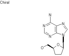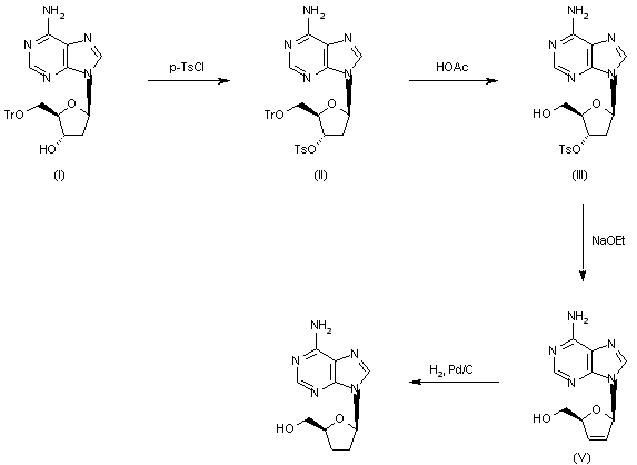 This compound is prepared by two related ways: 1) The partial silylation of adenosine (I) with tert-butyldimethylsilyl chloride and imidazole gives 5'-O-(tert-butyldimethylsilyl)adenosine (II), which by reaction with 1,1'-thiocarbonyldiimidazole (III) in hot DMF is converted into 5'-O-(tert-butyldimethylsilyl)-2',3'-O-thionocarbonyladenosine (IV). The desulfurization of (IV) with 1,3-dimethyl-2-phenyl-1,3,2-diazaphospholidine (V) or triethyl phosphite in THF yields 5'-O-(tert-butyldimethylsilyl)-2',3'-didehydro-2',3'-dideoxyadenosine (VI), which is deprotected with tetrabutylammonium fluoride in THF affording 2',3'-didehydro-2',3'-dideoxyadenosine (VII). Finally, this compound is hydrogenated with H2 over Pd/C in methanol. 2) The reaction of silylated adenosine (II) with CS2 and NaOH in DMSO, followed by methylation with methyl iodide gives 5'-O-(tert-butyldimethylsilyl)-2',3'-bis-O-[(methylthio)thiocarbonyl]ad enosine (VIII), which is desulfurized with tributyltin hydride and AIBN in refluxing toluene to yield the dideoxy-didehydroadenosine (VI), already obtained.