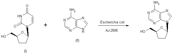 The hydrolysis of (V) affords 2',3'-dideoxyuridine (VI), which is finally submitted to transdeoxyribosilation with adenine (VII) by means of Escherichia coli AJ-2595 microorganisms.