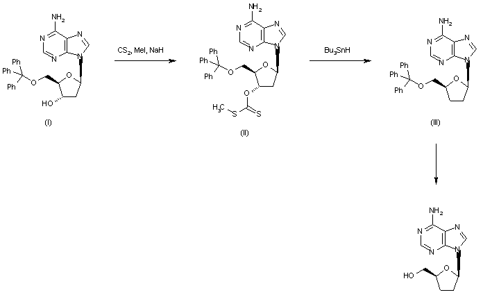 A new method for the synthesis of title compound has been reported: The reaction of 5'-O-triphenylmethyl-2'-deoxyadenosine (I) with CS2, methyl iodide and NaH gives the corresponding xanthate (II), which is reduced with tributyl hydrogen stannide to 5'-O-triphenylmethyl-2',3'-dideoxyadenosine (III). Finally, this compound is deprotected in the usual way.