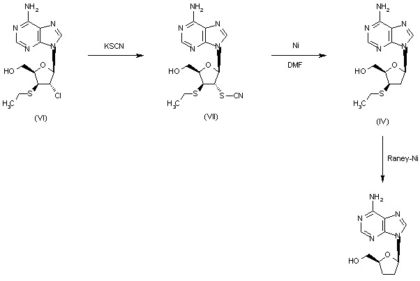 The reaction of 2',3'-dideoxy-2'chloro-3'-ethylthioadenosine (VI) with potassium thiocyanate gives 2',3'-dideoxy-2'-thiocyanato-3'-ethylthioadenosine (VII), which by treatment with Ni sponge in DMF at 100 C under H2 atmosphere is converted into compound (IV), which is finally treated with Raney-Ni in refluxing methyl cellosolve-ethanol (100 C).