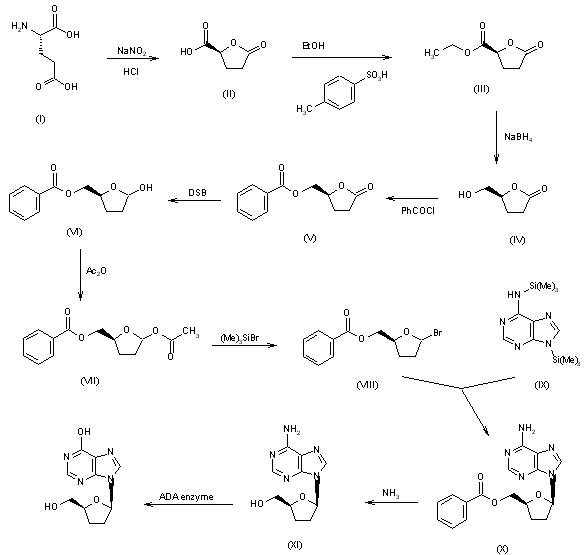 1) The stereospecific deamination - lactonization of L-glutamic acid (I) with NaNO2 - HCl in water gives (S)-(+)-gamma-carboxy-gamma-butyrolactone (II), which is esterified with ethanol and p-toluenesulfonic acid in the usual way, yielding the ethyl ester (III). The selective reduction of (III) with NaBH4 in ethanol affords (S)-(+)-gamma-(hydroxymethyl)-gamma-butyrolactone (IV), which is benzoylated with benzoyl chloride to the benzoate (V). The selective reduction of (V) with disiamyl borane in THF yields the alcohol (VI), which is acetylated with acetic anhydride in pyridine to the acetate (VII). The reaction of (VII) with trimethylsilyl bromide in dichloromethane affords the tetrahydrofuryl bromide (VIII), which is then condensed with the adenine (IX), giving 5'-O-benzoyl-2',3'-dideoxyadenosine (X). The deprotection of (X) with NH3 in methanol yields 2',3'-dideoxyadenosine, which is finally deaminated enzymatically with the enzyme adenosine deaminase.