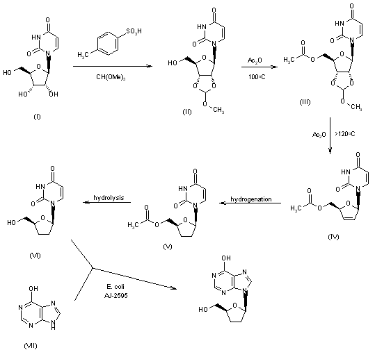 2) The reaction of uridine (I) with methyl orthoformate and p-toluenesulfonic acid gives the cyclic orthoester (II), which is acetylated with acetic anhydride at 100 C, yielding the 5'-acetoxy derivative (III). The reaction of (III) with acetic anhydride at temperatures over 120 C affords 5'-O-acetyl-2',3'-dideoxy-2',3'-didehydrouridine (IV), which is hydrogenated to 5'-O-acetyl-2',3'-dideoxyuridine (V). Hydrolysis of (V) affords 2',3'-dideoxyuridine (VI), which is finally submitted to a transdideoxyribosylation with hypoxanthine (VII) by incubation in an appropriate medium with Escherichia coli AJ 2595 resting cells.