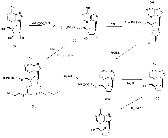 3) The reaction of inosine (I) with tert-butyldimethylsilyl chloride by means of imidazole in DMF gives the 5'-O-silyl derivative (II), which by reaction with CS2 and 3-bromopropionitrile by means of NaOH in DMSO is converted into 5'-O-(tert-butyldimethylsilyl)-2',3'-bis-O-(2-cyanoethyldithiocarbonyl)inosine (III). The reaction of (III) with tri-n-butyltin hydride and AIBN in refluxing toluene affords 5'-O-(tert-butyldimethylsilyl-2',3'-dideoxy-2',3'-didehydroinosine (IV), which is deprotected with tetrabutylammonium fluoride in THF to 2',3'-dideoxy-2',3'-didehydroinosine (V). Finally, this compound is hydrogenated with H2 over Pd/C in ethanol - water. 4) The reaction of (II) with 1,1'-thiocarbonyldiimidazole (DTI) in DMF gives 5'-O-(tert-butyldimethylsilyl)-2',3'-O-(thionocarbonyl)inosine (VI), which by reaction with refluxing triethyl phosphite is converted into the didehydro derivative (IV), already obtained (5).