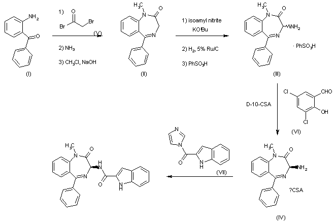 2-Aminobenzophenone (I) is acylated with bromoacetyl bromide followed by reaction with ammonia to form the [1,4]benzodiazepine. N1-Methylation produces 1,3-dihydro-1-methyl-5-phenyl-2H-[1,4]benzodiazepin-2-one (II). Treatment with isoamyl nitrate and t-BuOK gives an oxime, which is reduced by catalytic hydrogenation to racemic 3-amino-benzodiazepine (III), which is isolated as the crystalline benzenesulfonic acid salt. Crystallization-induced asymmetric transformation yields 3(S)-(-)-3-amino-1,3-dihydro-1-methyl-5-phenyl-2H-[1,4]benzodiazepin-2-one (IV). Acylation with indole-2-carbonylimidazolide produces MK-329.