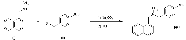By condensation of N-methyl-1-naphthylmethylamine (I) with 4-(tert-butyl)benzyl bromide (II) by means of Na2CO3 in DMF, followed by acidification with HCl in ethanol.