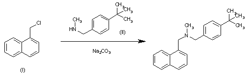 By condensation of 1-(chloromethyl)naphthalene (I) with N-(4-tert-butylbenzyl)-N-methylamine (II) by means of sodium carbonate in hot DMF.
