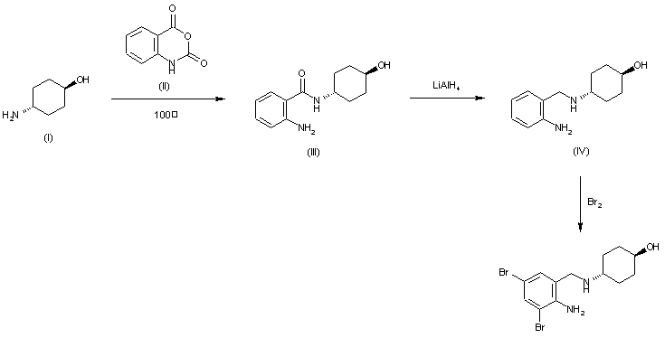 By condensation of trans-4-aminocyclohexanol (I) with isatoic anhydride (II) in hot (100 C) xylene to give 2-amino-N-(trans-4-hydroxycyclohexyl)benzamide (III) , m.p. 219.5-220 C, which is reduced with LiAlH4 in THF to (trans-4-hydroxycyclohexyl)(2-aminobenzyl)amine (IV) (oxalate, m.p. 185-6 C); this product is finally brominated with Br2 in acetic acid.