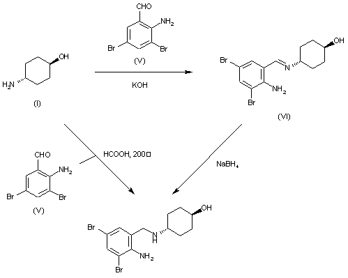 By condensation of trans-4-aminocyclohexanol (I) with 2-amino-3,5-dibromo-benzaldehyde (V) by means of formic acid at 200 C. When the condensation of the aminoalcohol (I) and the aldehyde (V) is performed with KOH in ethanol, the intermediate N-(2-amino-3,5-dibromobenzylidene)-trans-4-aminocyclohexanol (VI), m.p. 124.0-5.5 C is obtained, which is then reduced with NaBH4 in ethanol.