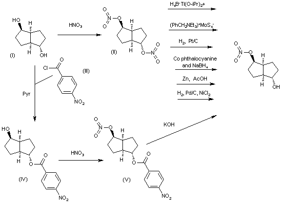 1. The nitration of isosorbide (I) with fuming HNO3 in acetic acid/acetic anhydride gives the dinitrate (II), which is selectively monoreduced by means of diisopropyltitanium tetrahydroborate (obtained by reaction of disopropyltitanium dichloride with benzyltriethylammonium borohydride) in dichloromethane to afford the isosorbide 5-nitrate. 2. The reduction of dinitrate (II) can also be performed with benzyl triethyl ammonium tetrathiomolibdate in DMF. 3. The reduction of dinitrate (II) can also be performed with H2 over PtO2/C in methanol. 4. The reduction of dinitrate (II) can also be performed with cobalt phthalocyanine and NaBH4 in methanol. 5. The reduction of dinitrate (II) can also be performed with Zn and HOAc in ethanol/water. 6. The reduction of dinitrate (II) can also be performed with H2 over Pd/C and NiCl2 in ethanol/water. 7. The reaction of isosorbide (I) with 4-nitrobenzoyl chloride (III) and pyridine in dichloromethane gives the isosorbide 2-O-(4-nitrobenzoate (IV), which is nitrated with HNO3 in acetic acid/acetic anhydride to yield the isosorbide 5-O-nitrate-2-O-(4-nitrobenzoate) (V). Finally, this compound is selectively hydrolyzed with KOH in methanol/dichloromethane.