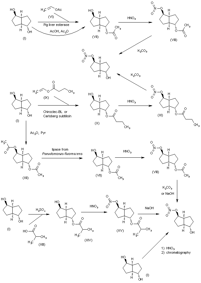 8. The enantioselective monoacetylation of isosorbide (I) by means of vinyl acetate (VI) catalyzed by Pig liver esterase in dichloromethane gives isosorbide 2-O-acetate (VII), which is nitrated with HNO3 in acetic anhydride to yield isosorbide 2-O-acetate-5-O-nitrate (VIII). Finally, this compound is deacetylated by means of K2CO3 in methanol. 9. The enantioselective monoacylation of isosorbide (I) by means of vinyl butyrate (IX) catalyzed by Chiraclec-BL in THF or Carlsberg subtilisin in tert-butanol gives isosorbide 2-O-butyrate (X), which is nitrated with HNO3 in acetic anhydride to yield isosorbide 2-O-butyrate-5-O-nitrate (XI). Finally, this compound is deacylated by means of K2CO3 in methanol. 10. The acylation of isosorbide (I) with acetic anhydride and pyridine gives the diacetate (XII), which is enantioselectively monodeacetylated by means of lipase from Pseudomonas fluorescens in THF to yield isosorbide 2-O-acetate (VII). This compound is then nitrated to (VIII) and finally deacetylated as already described. 11. The acylation of isosorbide (I) with HOAc and Ac2O gives (after purification by crystallization) isosorbide 2-O-acetate (VII), which is nitrated to (VIII) and finally deacetylated as already described. 12. The acylation of isosorbide (I) with isobutyric acid (XIII) by means of sulfuric acid in refluxing chlorobenzene/toluene gives isosorbide 2-O-isobutyrate (XIV), which is nitrated with HNO3/H2SO4 to yield isosorbide 2-O-isobutyrate-5-O-nitrate (XV). Finally, this compound is deacylated by means of NaOH in toluene/water. 13. The nitration of isosorbide (I) by means of HNO3 in HOAc/Ac2O gives a 3.5/1 mixture of isosorbide-5-O-nitrate and isosorbide 2-O-nitrate that is separated by column chromatography over alumina. 14. The nitration of isosorbide (I) with HNO3 in benzene/HOAc/Ac2O, followed by a purification step yields the target isosorbide-5-O-nitrate.