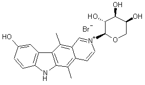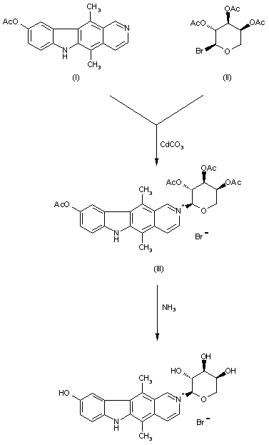 The condensation of 9-acetoxyellipticine (I) with 2,3,4-tri-O-acetyl-beta-L-arabinopyranosyl bromide (II) by means of CdCO3 in refluxing nitromethane gives the corresponding tetraacetoxy derivative (III), which is then deprotected by treatment with dry ammonia in methanol.