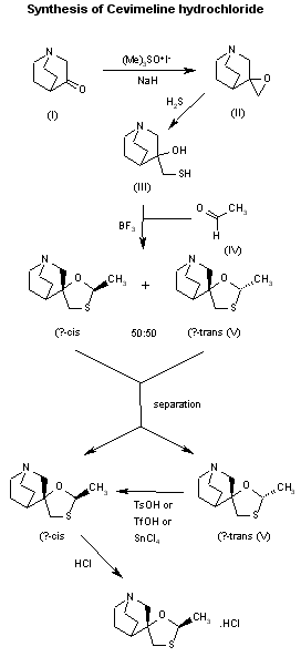 Reaction of quinuclidin-3-one (I) with trimethylsulfoxonium iodide and NaH in DMSO gives epoxide (II), which is opened with SH2 in NaOH/water, yielding 3-hydroxy-3-(sulfanylmethyl)quinuclidine (III). The cyclization of compound (III) with acetaldehyde (IV) catalyzed by boron trifluoride ethearate or by SnCl4, POCl3, H3PO4 or p-toluenesulfonic acid affords a mixture of two diastereomeric spiroracemates, the (?-trans (V) and (?-cis (cevimeline). This mixture is separated by fractional recrystallization in acetone or by TLC chromatography, and treated with hydrochloric acid. The (?-trans-compound (V) can be isomerized to cevimeline by treatment with an acidic catalyst such as an organic sulfonic acid (trifluoromethanesulfonic acid, p-toluenesulfonic acid or methanesulfonic acid), a Lewis acid (SnCl4, FeCl3, BF3 or AlCl3) or sulfuric acid in refluxing toluene, hexane or CHCl3. Cevimeline hydrochloride hemihydrate is obtained from the above mentioned hydrochloride by a complex work-up using water, isopropanol and n-hexane.