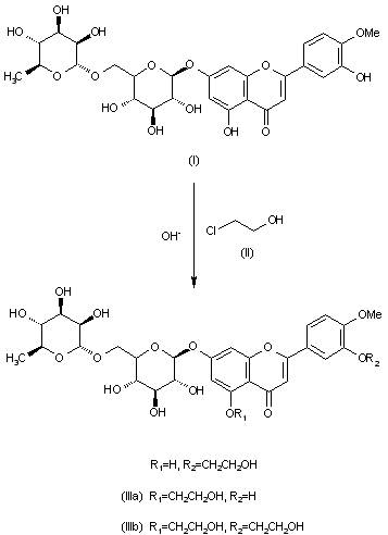 By reaction of diosmin (I) with 2-chloroethanol (II) in alkaline aqueous medium.