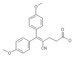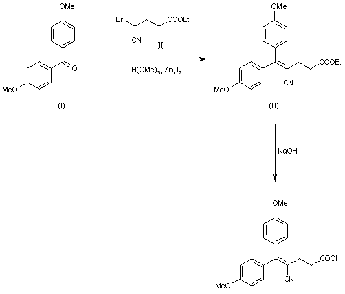 The condensation of 4,4'-dimethoxybenzophenone (I) with ethyl 4-bromo-4-cyanobutyrate (II) by means of trimethyl borate, Zn and I2 in THF gives ethyl 4-cyano-5,5-bis(4-methoxyphenyl)-4-pentenoate (III), which is saponified with NaOH in hot dioxane-water.