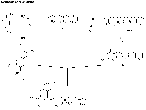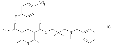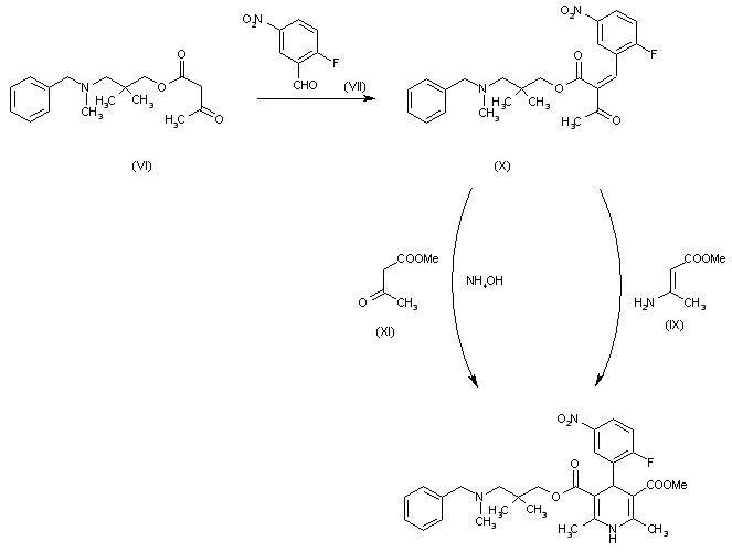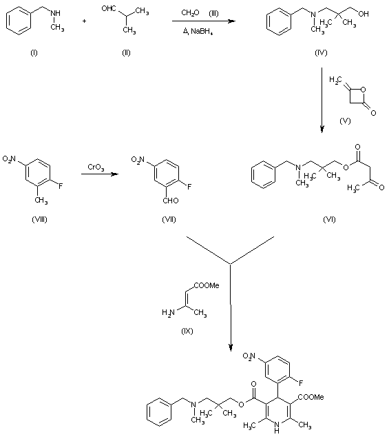 1) The reaction of N-methyl-N-benzylamine (I) with isobutyraldehyde (II) and formaldehyde (III) in refluxing isopropanol, followed by hydrogenation with NaBH4 gives 3-(N-benzyl-N-methylamino)-2,2-dimethylpropanol (IV), which is condensed with diketene (V) in refluxing benzene to yield 3-(N-benzyl-N-methylamino)-2,2-dimethylpropyl acetoacetate (VI). Finally, this compound is submitted to cyclization with 2-fluoro-5-nitrobenzeldehyde (VII) (prepared by oxidation of 2-fluoro-5-nitrotoluene (VIII) with CrO3 in acetic ahydride-H2SO4) and methyl 3-aminocrotonate (IX) in refluxing isopropanol.