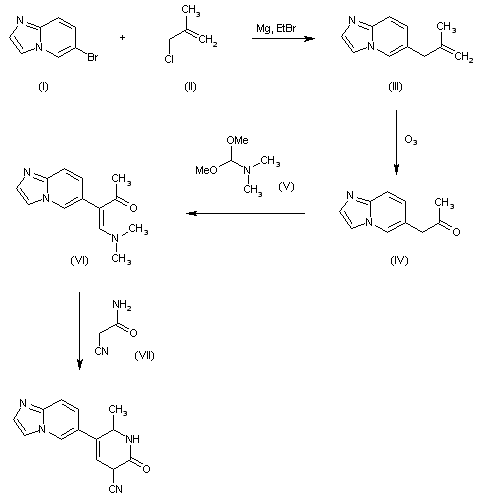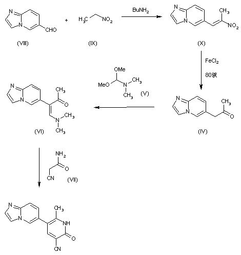 1) The condensation of 6-bromoimidazo[1,2-a]-pyridine (I) with 2-(chloromethyl)propene (II) by means of Mg and ethyl bromide in THF gives 6-(2-methyl-2-propenyl)imidazo[1,2-a]pyridine (III), which is ozonolyzed with O3 yielding 1-(imidazo[1,2-a]-pyridin-6-yl)-2-propanone (IV). The condensation of (IV) with dimethylformamide dimethylketal (V) in hot DMF affords 4-(dimethylamino)-3-(imidazo[1,2-a]-pyridin-6-yl)-3-buten-2-one (IV), which is finally cyclized with 2-cyanoacetamide (VII) by means of sodium methoxide in hot DMF.