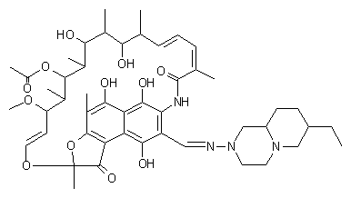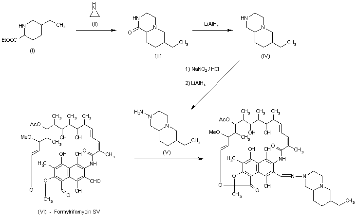The cyclization of 5-ethylpiperidine-2-carboxylic acid ethyl ester (I) with aziridine (II) in ethanol gives 7-ethylperhydropyrido[1,2-a]pyrazin-1-one (III), which is reduced with LiAlH4 to yield 7-ethylperhydropyrido[1,2-a]pyrazine (IV). The reaction of (IV) with NaNO2/HCl, followed by reduction with LiAlH4, affords 7-ethylperhydropyrido[1,2-a]pyrazin-2-amine (V), which is finally condensed with rifamicin SV-3-carbaldehyde (VI).