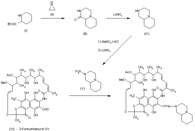 The cyclization of piperidine-2-carboxylic acid ethyl ester (I) with aziridine (II) in ethanol gives perhydropyrido[1,2-a]pyrazin-1-one (III), which is reduced with LiAlH4 to yield perhydropyrido[1,2-a]pyrazine (IV). The reaction of (IV) with NaNO2/HCl, followed by reduction with LiAlH4, affords perhydropyrido[1,2-a]pyrazin-2-amine (V), which is finally condensed with rifamicin SV-3-carbaldehyde (VI).