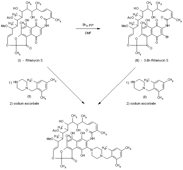 This compound has been obtained by two related ways: 1. By direct condensation of rifamycin S (I) with 1-(2,4,6-trimethylphenyl)piperazine (II), followed by reduction of the quinone subunit to the target hydroquinone with sodium ascorbate. 2. The bromination of rifamycin S (I) with Br2/pyridine in DMF gives 3-bromorifamycin S (III), which is condensed with piperazine (II) and reduced to the target hydroquinone as before.