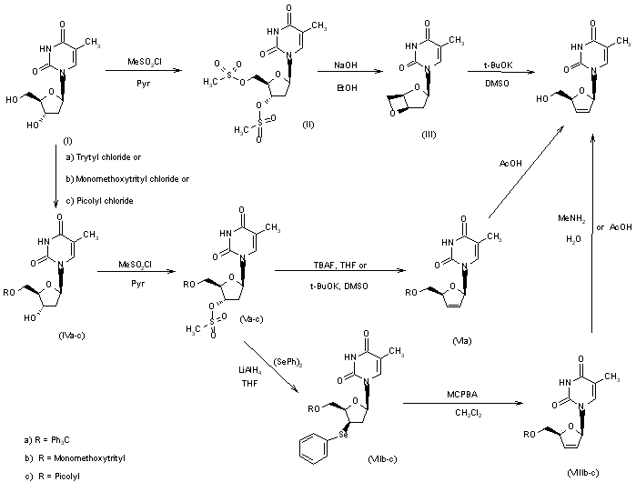 1) The first method ever reported involves the mesylation of thymidine (I) to give dimesylate (II), which is treated with sodium hydroxide in ethanol to yield oxetane (III). Finally, (III) is converted to stavudine by means of potassium tert-butoxide in DMSO. This process has been modified in order to obtain large quantities or to obtain [2-14C]-stavudine starting from [2-14C]-thymidine. 2) A second closely related method, but using a different protecting group strategy, involves tritylation of the primary hydroxyl group of thymidine to give (IVa), which is then mesylated to give (Va). Elimination with TBAF/THF or t-BuOK/DMSO yields compound (VI), which is finally deprotected with acetic acid. 3) A third synthesis starting from thymidine involves its protection with monomethoxytrityl chloride or picolyl chloride to give (IVb) or (IVc), respectively, which are mesylated to give (Vb) or (Vc). These are treated with phenyl diselenide and lithium aluminum hydride in tetrahydrofuran to yield compounds (VIIb) or (VIIc), which are treated with m-chloroperbenzoic acid in dichloromethane to afford (VIIIb) or (VIIIc). Finally, (VIIIb) is deprotected with methylamine in water and (VIIIc) is deprotected with acetic acid.
