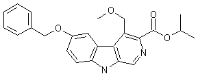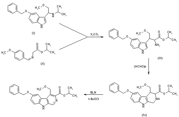 The condensation of 5-benzyloxy-3-[1-(isopropylamino)-2-methoxyethyl]indole (I) with N-(4-methylbenzylidene)glycine isopropyl ester (II) by means of K2CO3 in hot DMF gives 2-amino-3-(5-benzyloxyindol-3-yl)-4-methoxybutyric acid isopropyl ester (III), which is cyclized with paraformaldehyde in refluxing xylene, yielding 6-benzyloxy-4-(methoxymethyl)-1,2,3,4-tetrahydro-9H-pyrido[3,4-b]indole - 3-carboxylic acid isopropyl ester (IV). Finally, this compound is dehydrogenated with tert-butyl hypochlorite and triethylamine in dichloromethane.