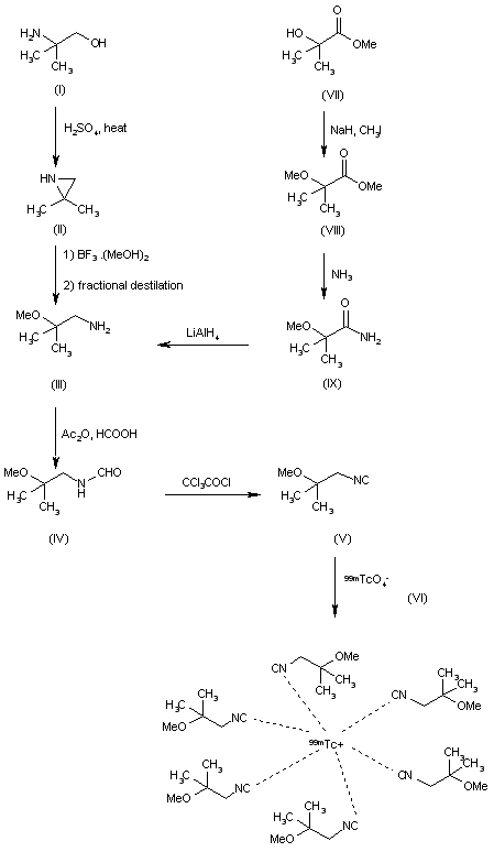 This compound can be prepared by two different ways: 1) The dehydration of 2-amino-2-methylpropranol (I) with H2SO4 at 170-200 C gives 2,2-dimethylazirine (II), which by reaction with methanol by means of boron trifluoride - methanol complex and fractional distillation affords 2-methoxy-2-methylpropylamine (III). The reaction of (III) with formic acid in acetic anhydride yields N-(2-methoxy-2-methylpropyl)formamide (IV), which by reaction with diphosgene (trichloromethyl chloroformate) and triethylamine in dichloromethane gives 2-methoxy-2-methylpropylisonitrile (MIBI) (V). Finally, this compound or its CuBF4 complex Cu(MIBI)4BF4 is treated with 99mTcO4 (VI) and sodium dithionite or formamide sulfinic acid respectively, in ethanol - water. 2) The methylation of methyl 2-hydroxyisobutylrate (VII) with NaH - methyl iodide in DMF - THF gives methyl 2-methoxy-2-methylpropanoate (VIII), which by reaction with ammonia is converted to the corresponding amide (IX). Finally, this compound is reduced with LiAlH4 in THF yielding the amine (III), already obtained.