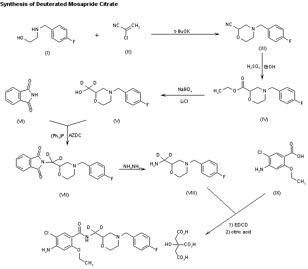 The synthesis of deuterated mosapride citrate has been reported: The cyclization of N-(4-fluorobenzyl)ethanolamine (I) with 2-chloroacrylonitrile (II) in ethyl ether gives 4-(4-fluorobenzyl)morpholine-2-carbonitrile (III), which is submitted to alcoholysis with ethanol and H2SO4, yielding the corresponding ethyl ester (IV). The reduction of (IV) with deuterated sodium borohydride (NaBD4) in THF affords the deuterated hydroxymethyl derivative (V), which is condensed with phthalimide (VI) by means of triphenylphosphine and dimethyl azodicarboxylate (AZDC) in THF to give the N-substituted phthalimide (VII). The cleavage of (VII) with hydrazine hydrate in refluxing ethanol yields the deuterated methylamine derivative (VIII), which is finally condensed with 4-amino-5-chloro-2-ethoxybenzoic acid (IX) by means of 1-ethyl-3-[3-(dimethylamino)propyl]carbodiimide (EDCD) in dichloromethane, and treated with citric acid in the usual way.