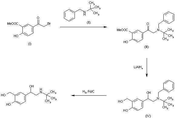 The reaction of methyl 5-bromoacetylsalicylate (I) with benzyl tert-butylamine (II) in methyl ethyl ketone gives methyl 5-(N-benzyl-N-tert-butyl-gycyl)salicylate (III), which is reduced with LiAlH4 in refluxing THF yielding alpha'-(N-benzyl-N-tert-butylami-nomethyl)-4-hydroxy-m-xylene-alpha,alpha'-diol (IV). Finally, this compound is debenzylated by hydrogenation with H2 over Pd/C in ethanol-water.