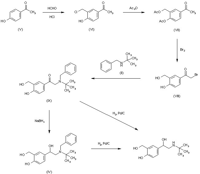 The chloromethylation of 4-hydroxyacetophenone (V) with formaldehyde and HCl in hot water gives 3-chloromethyl-4-hydroxyacetophenone (VI), which is treated with acetic anhydride-sodium acetate in refluxing acetic acid to afford 3-acetoxymethyl-4-acetoxyacetophenone (VII). The bromination of (VII) with Br2 in chloroform yields after hydrolysis 3-hydroxymethyl-4-hydroxyphenacyl bromide (VIII), which is condensed with benzyl tert-butylamine (II) in refluxing benzene giving alpha-(N-benzyl-N-tert-butylamino)-4-hydroxy-3-hydroxymethylacetophenone (IX). Finally, this compound is hydrogenated with H2 over Pd/C in ethanol. An alternative method of hydrogenation of (IX) is its reduction with NaBH4 - ethanol, to afford the previously obtained product (IV), which is reduced with H2 over Pd/C in ethanol.