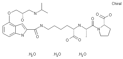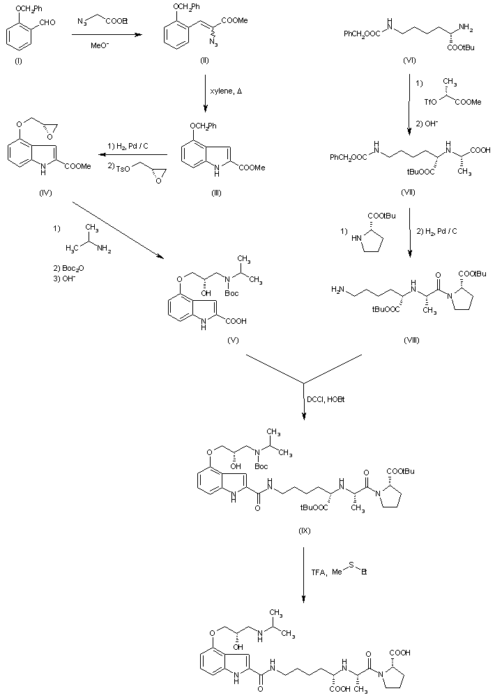 | 合成路线图解说明: Thermal cyclization of the azidocinnamate (II), obtained from O-benzylsalicylaldehyde (I) by methoxide condensation with ethyl azidoacetate, provides methyl 4-benzyloxyindol-2-carboxylate (III). Debenzylation by catalytic hydrogenolysis and alkylation of the phenol with (2S)-glycidyl tosylate gives the chiral oxirane (IV). Ring opening of (IV) followed by protection of the secondary amine by reaction with di-tert-butyldicarbonate and saponification of the methyl ester gives the key (S)-beta-blocker synthon (V). The required ACE inhibitor svnthon (VIII) is assembled from tert-butyl-N'-benzyloxycarbonyl-(S)-lysinate (VI). Alkylation of the alpha-amino group with the triflate of methyl (R)-lactate and saponification of the methyl ester gives N-[5-benzyloxycarbonylamino-1-(S)-tert-butyloxycarbonylpent-1-yl-(S)-alanine (VII). Condensation of (VII) with tert-butyl-(S)-prolinate. mediated by dicyclohexylcarbodiimide and 1-hydroxybenzotriazole, followed by hydrogenolytic removal of the benzyloxycarbonyl group, provides tert-butyl-N-[5-amino-1-(S)-tert-butyloxycarbonylpent-1-yl]-(S)-alanyl-(S)-prolinate (VIII). Coupling of (V) with (VIII) using dicyclohexylcarbodiimide-1-hydroxybenzotriazole and removal of the tert-butyl protecting groups by acidolysis in trifluoroacetic acid, with ethyl methyl sulfide as a scavenger, gives crude BW-8385C as the bistrifluoroacetate salt. Purification is achieved by ion exchange chromatography on DE52 cellulose, followed by reverse-phase desalting to provide pure BW-B385C as the zwitterionic trihydrate. |
