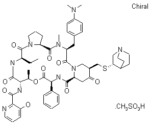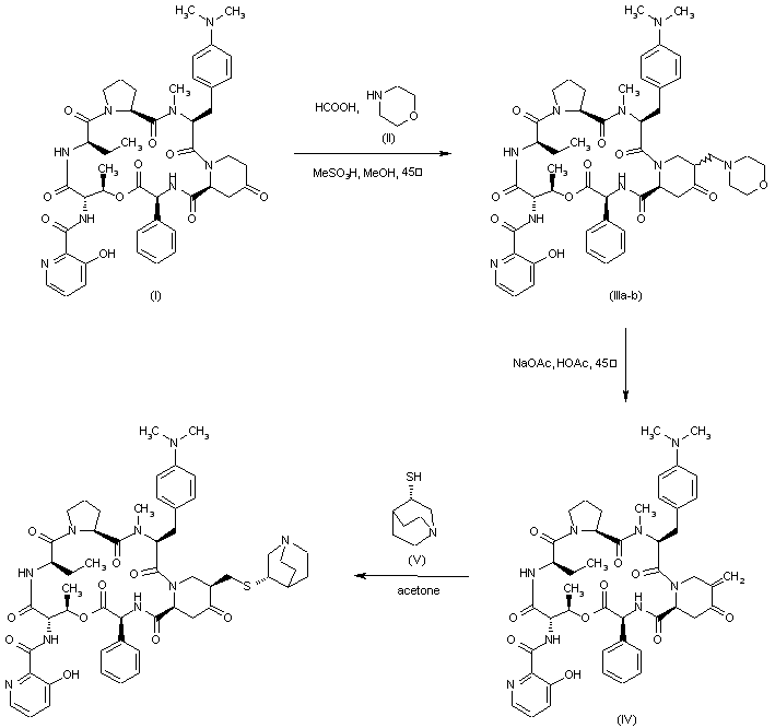 The condensation of the cyclopeptide analogue (I) with morpholine (II) and formaldehyde by means of MsOH in hot methanol gives the 4-morpholinylmethyl derivative (III), which by a treatment with NaOAc in hot acetic acid yields the methylene derivative (IV). Finally this compound is condensed with quinuclidine-3(S)-thiol in hot acetone.