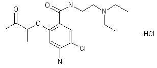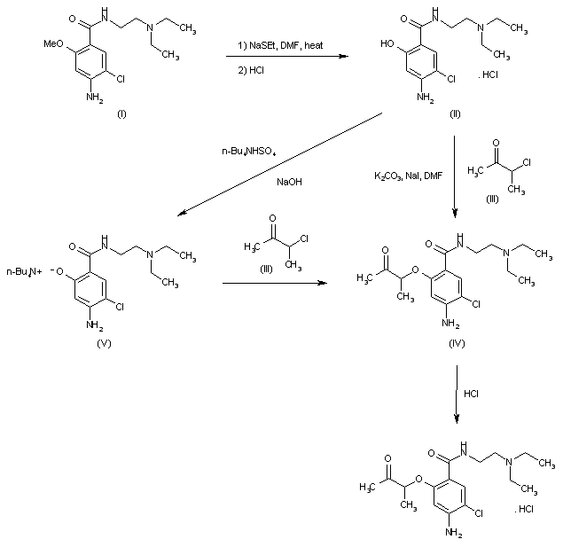 The demethylation of 4-amino-5-chloro-N-[2-(diethylamino)ethyl]-2-methoxybenzamide (I) with EtS-Na in hot DMF gives the hydroxy compound (II), which is acylated with 3-chloro-2-butanone (III) by means of K2CO3 and NaI in DMF to yield 4-amino-5-chloro-N-[2-(diethylamino)ethyl]-2-(1-methyl-2-oxopropoxy)benzamide (IV). Finally, this compound is treated with HCl to furnish the target hydrochloride. Alternatively, the alkylation of the hydroxy compound (II) can also be performed by reaction of (II) with tetrabutylammonium bisulfate and NaOH to give the tetrabutylammonium phenolate (V), which is alkylated with the chlorobutanone (III) to give (IV).