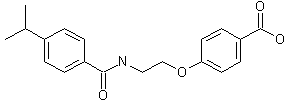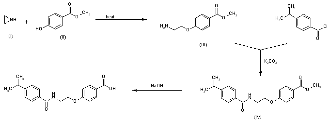 The condensation of aziridine (I) with methyl 4-hydroxybenzoate (II) in refluxing chloroform gives methyl 4-(2-aminoethoxy)benzoate (III), which is acylated with 4-isopropylbenzoyl chloride by means of K2CO3 in chloroform yielding methyl 4-[2-(4-isopropylbenzamido)ethoxy]benzoate (IV). Finally, this compound is hydrolyzed with NaOH in refluxing water.