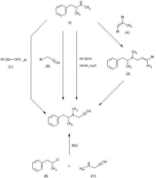 Compound can be prepared in several related ways: 1) The condensation of N-(1-phenylisopropyl)methylamine (I) with 1,2-dibromopropene (A) by heating at 100 C gives N-(1-phenylisopropyl)-N-methyl-2-bromopropenylamine (II), which is then dehydrobrominated and isomerized by treating with KOH in refluxing ethanol water. 2) By heating a mixture of (I) and propargyl bromide (B) at 100 C. 3) By reductocondensation of (I) with propargyl aldehyde (C) by means of amalgamated Al in ethanol. 4) By condensation of (I) with formaldehyde and acetylene by means of CuCl in hot dioxane. 5) By condensation of 1-phenylisopropyl chloride (III) with N-methylpropargylamine (IV) by heating at 80 C in a sealed tube.