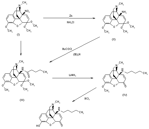 The reduction of 14beta-nitrocodeinone dimethylketal (I) with AlCl3-Zn and ammonium chloride in refluxing methanol gives 14beta-aminocodeinone dimethylketal (II), which is acylated with pentanoyl chloride and triethylamine in hot chloroform yielding 14beta-(pentanoylamino)codeinone dimethylketal (III). The reduction of (III) with LiAlH4 in THF affords 14beta-(pentylamino)codeinone (IV), which is finally demethylated by treatment with boron trichloride in methylene chloride at -30 C.